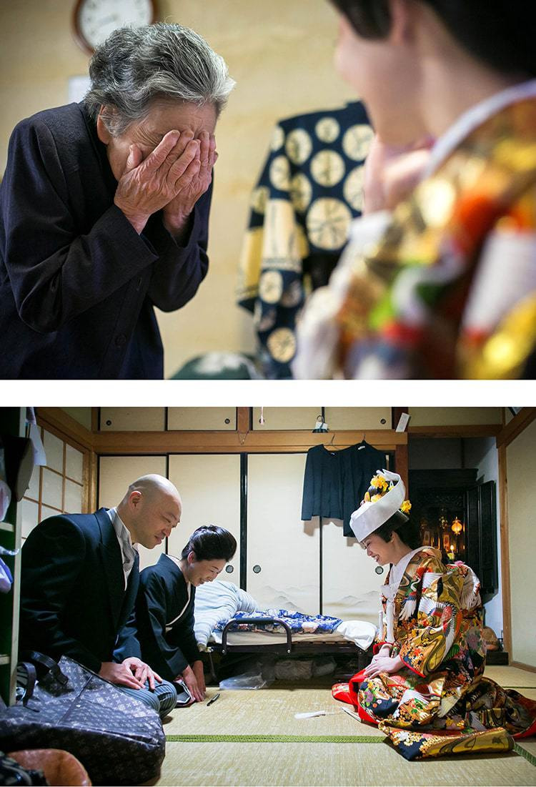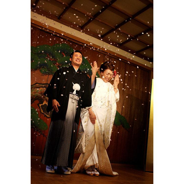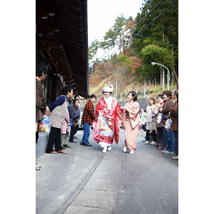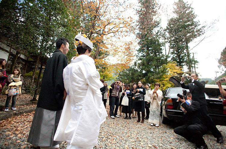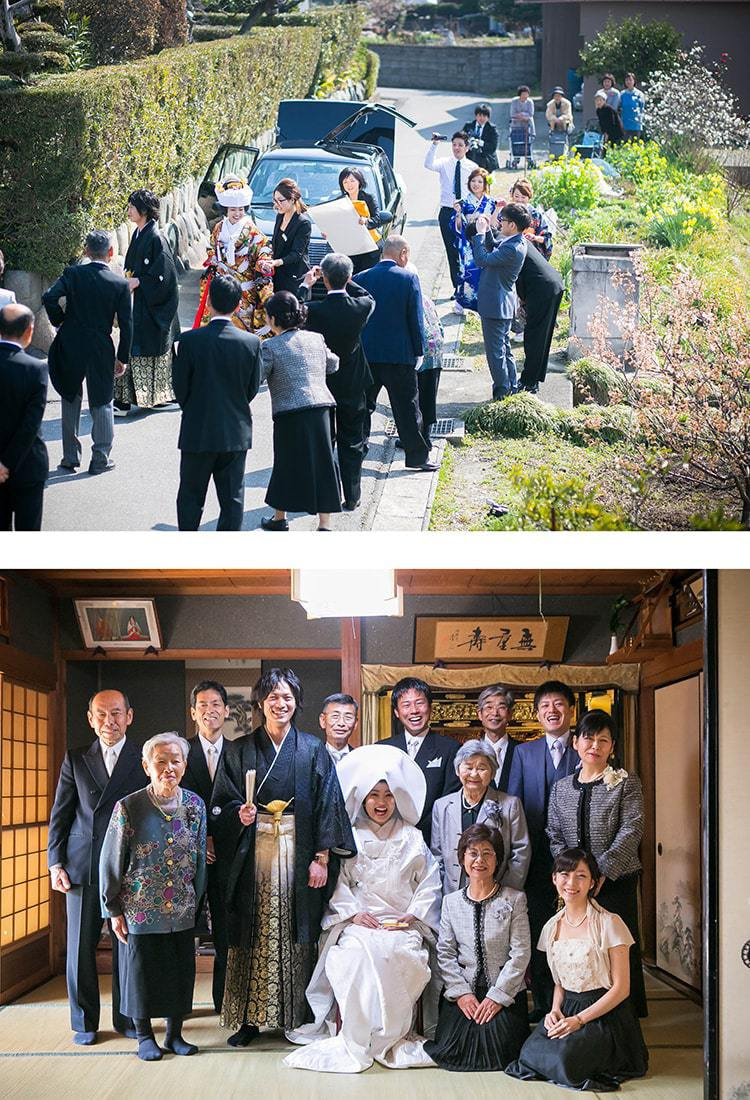 白無垢姿の花嫁さんが手をひかれ